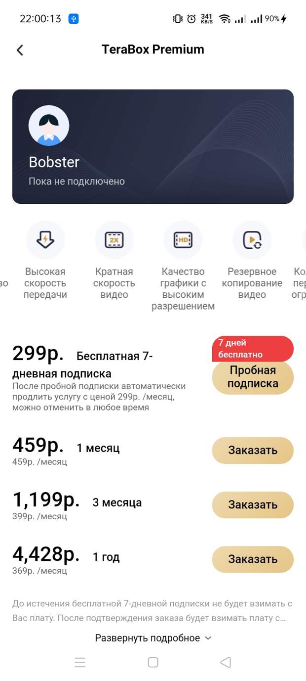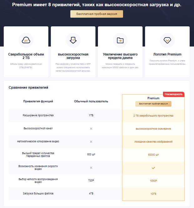 Кому не хватило ограничения в 1024 Гб и не умеет зарегистрировать другую учетную запись с бесплатным облаком, может воспользоваться Premium аккаунтом. Premium аккаунт дает несколько привилегий, таких как увеличение свободного пространства до 2ТБ (2048ГБ), увеличенная скорость загрузки как через браузерную версию, так и через APP приложение, увеличение дампа передачи файлов до 5000 за сессию и таких немаловажных как просмотр видео в FHD разрешении и загрузка файлов более 10Гб. Если сравнивать бесплатную версию в 1024 Гб и премиальную с получением сверхбольшого пространства в 2Тб, то выбор очевиден.