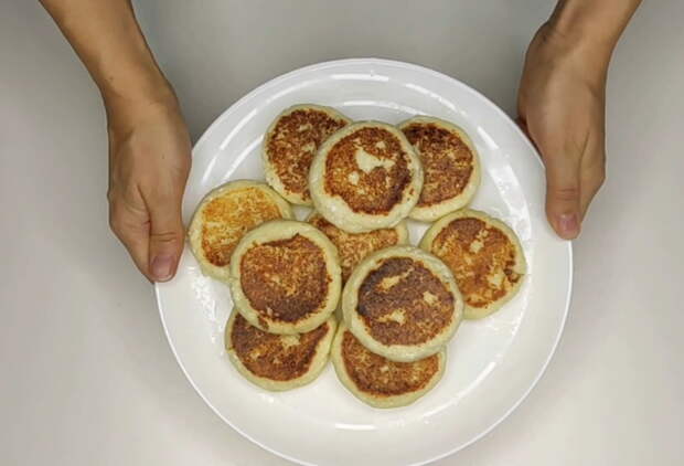 В конце остается лишь дождаться пока сырнички остынут и подать их к столу со сметаной, фруктами или мёдом.