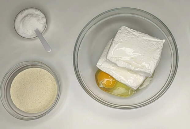 - Сперва возьми глубокую миску и помести в нее творог. К слову, творог для приготовления сырников лучше всего брать 5%. Также вбей в миску яйцо и добавь стевию.
