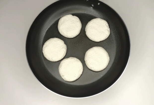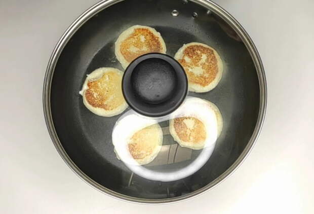- Обжариваем сырники с двух сторон до золотистости на среднем огне. После чего накрываем сковороду крышкой, убавляем огонь и даем сырникам пропечься еще в течение 5 минут.