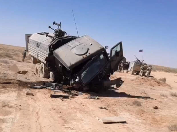 В Сети появились кадры с места нападения на российскую колонну. Конвой, по некоторым данным, вез гуманитарную помощь в сирийские населенные пункты.