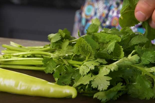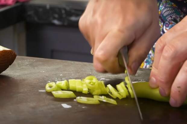 - Нарежь кусочками зеленый (обязательно) перец чили. Ориентируйся по его остроте, чтобы не переборщить.