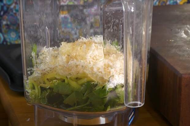 - Помести кинзу, мяту, орехи, перец чили, молотый перец, сыр и растительное масло в чашу блендера. Количество масла определяй на глаз, чтобы получившийся соус не был ни слишком густым ни слишком жидким.
